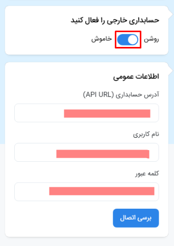 اتصال به حسابداری یکی از روشهای تعریف کالا در پنل مدیریتی سپهر است. شما میتوانید با انتخاب یکی از حسابداریها، فعال کردن حسابداری خارجی و وارد کردن اطلاعات مورد نیاز (API، نام کاربری و کلمه عبور) به صورت کامل پنل مدیریتی سپهر را به حسابداری خود متصل کنید. با برقراری این اتصال، تمام کالاهای موجود در نرم افزار حسابداری در پنل مدیریتی وبسایت با جزئیاتی مانند تعداد، برند، مدلها و … تعریف میشوند.