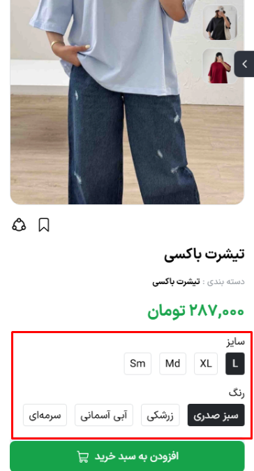 رنگ و سایز در صفحهی محصولاتی مانند پوشاک به شکل زیر نمایش داده میشوند.